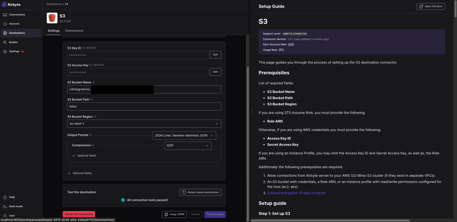 5. Click Test and save and wait for Airbyte to confirm the Destination is set up correctly.