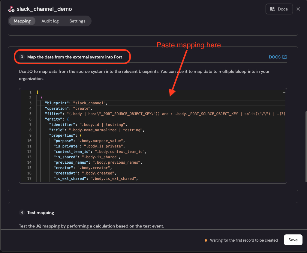 6. Scroll down to the section titled "Map the data from the external system into Port" and paste the following mapping: